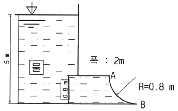그림과 같이 반지름 0.8m이고 폭이 2m인 곡면 AB가 수문으로 이용된다. 물에 의한 힘의 수평성분의 크기는 약 몇 kN 인가? (단, 수문의 폭은 2m 이다.)