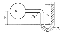 그림의 액주계에서 밀도 ρ1 = 1000 kg/m3, ρ2 = 13600 kg/m3, 높이 h1 = 500mm, h2 = 800mm 일 때 중심 A의 계기압력은 몇 kPa 인가?