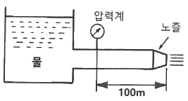 그림과 같이 노즐이 달린 수평관에서 계기압력이 0.49MPa 이었다. 이 관의 안지름이 6cm이고 관의 끝에 달린 노즐의 지름이 2cm 이라면 노즐의 분출속도는 몇 m/s인가? (단, 노즐에서의 손실은 무시하고, 관마찰계수는 0.025 이다.)