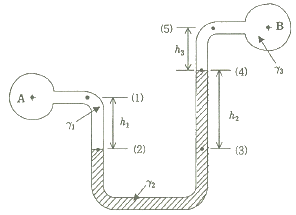 그림과 같은 U자관 차압 액주계에서 A와 B에 있는 유체는 물이고 그 중간에 유체는 수은(비중 13.6)이다. 또한, 그림에서 h1=20cm, h2=30cm, h3=15cm 일 때 A의 압력(PA)와 B의 압력(PB)의 차이(PA - PB)는 약 몇 kPa 인가?