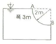 그림과 같은 1/4원형의 수문(水門) AB가 받는 수평성분 힘(FH)과 수직성분 힘(FV)은 각각 약 몇 kN 인가? (단, 수문의 반지름은 2m 이고, 폭은 3m 이다.)