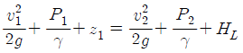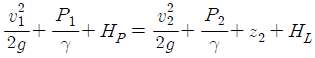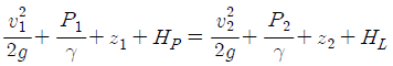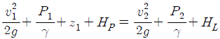 펌프의 일과 손실을 고려할 때 베르누이 수정 방정식을 바르게 나타낸 것은? (단, HP와 HL은 펌프의 수두와 손실 수두를 나타내며, 하첨자 1, 2는 각각 펌프의 전후 위치를 나타낸다)