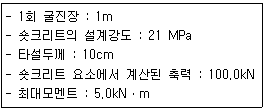암반층에 시공되는 NATM 터널에 대해 평면변형률 조건의 2차원 수치해석을 수행하여 숏크리트에 발생한 부재력을 평가한 결과가 보기와 같을 때, 숏크리트에 발생한 휭압축응력(㉠)과 허용 응력법에 의해 평가한 숏크리트의 안정성 판단 결과(㉡)로 옳은 것은? (단, 휨 압축응력에 대해서만 평가한다.)