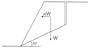 다음 그림과 같은 형상의 완전 건조된 사면에 지진이 발생하여 0.05g의 지진 가속도(α)가 사면에 가해졌다. 암괴의 중량(W) 0.1MN, 불연속면의 점착력 0, 불연속면의 경사각 30°, 불연속면의 마찰각 30°인 경우 사면의 안전율은? (단, 지진에 의한 가속도는 등가의 정적인 힘 αW로 대체한다.)
