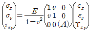 응력-변형률의 관계는 등반탄성체에서 평면응력의 경우 σ=[D]ε과 같은 행렬식으로 간단히 표현할 수 있다. 이때의 행렬식이 다음식과 같다면 (A)에 알맞은 것은? (단, E: 영률, v: 푸아송 비이다.)