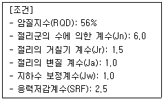 Q-system에 의해 암반을 분류하기 위해 대상 암반에 대한 조사 및 시험한 결과가 아래 [조건]과 같을 때 Q값은?
