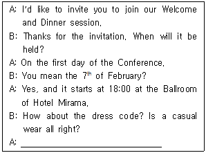 다음 대화에서 마지막 A의 응답으로 적절한 것은?