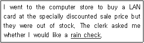 다음 밑줄 친 rain check과 의미가 가장 가까운 것은?