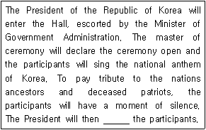The following describes the order of a national ceremony. Select proper expression for blank.