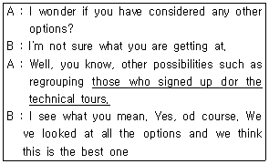 다음 대화의 밑줄 친 부분의 우리말 번역으로 가장 적절한 것은?