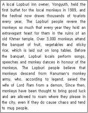 Lopburi 사람들은 원숭이를 매우 존경해서 매년 호화로운 잔치를 연다.