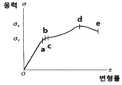 인장 시험을 위한 응력-변형률 그래프에서 각 항목에 해당하는 명칭으로 옳은 것은?