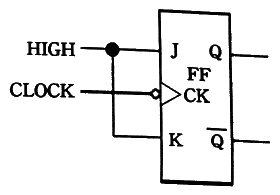 JK 플립플롭의 J와 K의 입력 모두를 그림과 같이 High에 결선했을 때, 어떠한 플립플롭과 같은 동작을 하는가?