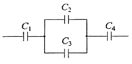 그림에서 4개의 커패시터 C1, C2, C3, C4가 직병렬로 연결되어 있을 때, 합성 정전용량은 약 몇 ㎌인가? (단, C1 = 1㎌, C2 = 2㎌, C3 = 3㎌, C4 = 4㎌ 이다.)