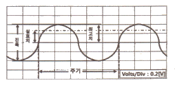 오실로스코프에 연결하여 파형을 측정하였을 때 측정 파형이 다음 그림과 같았다. 최고점간(peak to peak) 전압(VP-P)은 몇 V 인가? (단, 프로브는 10:1을 사용하였다.)