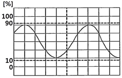 다음 파형은 오실로스코프로 교류전압을 측정했을 때의 파형이다. 이 때 교류전압 최대값은? (단, VOLTS/DIV=4[mV/DIV], 10:1 프로브 사용)(오류 신고가 접수된 문제입니다. 반드시 정답과 해설을 확인하시기 바랍니다.)