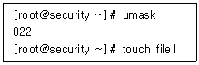 다음과 같이 시스템에 설정된 umask 값이 '022'인 경우, 파일(file1)을 생성하였을 때 생성된 파일의 접근권한은?