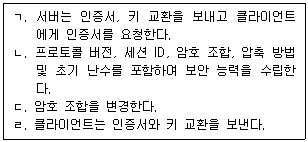 SSL(Secure Socket Layer) 핸드셰이크 프로토콜 처리에서 클라이언트와 서버 사이의 논리 연결을 설립하는 데 필요한 교환 단계를 순서대로 바르게 나열한 것은?
