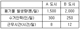 다음은 폐기물 수거에 대한 효율을 결정하기 위한 자료이다. A 도시의 수거효율은?