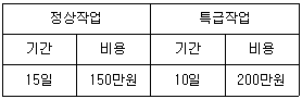 어떤 공정에서 작업을 하는데 있어서 소요되는 기간과 비용이 다음 표와 같을 때 비용구배는? (단, 활동시간의 단위는 일(日)로 계산한다.)