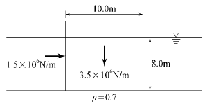 그림과 같이 단위폭당 자중이 3.5×106N/m인 직립식 방파제에 1.5×106N/m의 수평 파력이 작용할때, 방파제의 활동 안전율은? (단, 중력가속도=10.0m/s2, 방파제와 바닥의 마찰계수=0.7, 해수의 비중 =1로 가정하며, 파랑에 의한 양압력은 무시하고, 부력은 고려한다.)