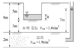 다음 그림과 같이 피압수압을 받고 있는 2m 두께의 모래층이 있다. 그 위로 포화된 점토층을 5m 깊이로 굴착하는 경우 분사현상이 발생하지 않기 위한 수심(h)은 최소 얼마를 초과하도록 하여야 하는가?