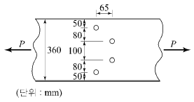 그림과 같은 두께 13mm의 플레이트에 4개의 볼트 구멍이 배치 되어있을 때 부재의 순단면적은? (단, 구멍의 직경은 24mm이다.)
