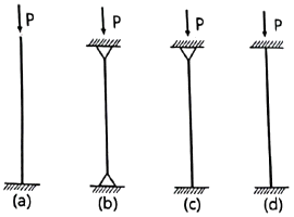 그림과 같은 기둥에서 좌굴하중의 비 (a) : (b) : (c) : (d)는? (단, EI와 기둥의 길이는 모두 같다.)