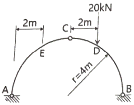 그림과 같은 r=4m인 3힌지 원호 아치에서 지점 A에서 2m 떨어진 E점에 발생하는 휨모멘트의 크기는?