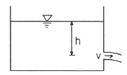 그림과 같은 수조 벽면에 작은 구멍을 뚫고 구멍의 중심에서 수면까지 높이가 h일 때, 유출속도 V는? (단, 에너지 손실은 무시한다.)