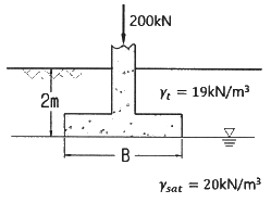 그림과 같은 정사각형 기초에서 안전율을 3으로 할 때 Tezanghi의 공식을 사용하여 지지력을 구하고자 한다. 이때 한 변의 최소길이(B)는? (단, 물의 단위중량은 9.81 kN/m3, 점착력(c)은 60 kN/m2, 내부 마찰각(ø)은 0° 이고, 지지력계수 Nc = 5.7, Nq = 1.0, Nγ = 0 이다.)