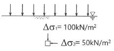 그림과 같은 지반에서 하중으로 인하여 수직응력(△σ1)이 100kN/m2 증가되고 수평응력(△σ3)이 50kN/m2 증가되었다면 간극수압은 얼마나 증가되었는가? (단, 간극수압계수 A=0.5이고, B=1 이다.)
