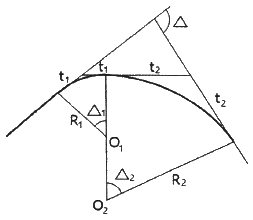 그림과 같은 복곡선에서 t1 + t2 의 값은?