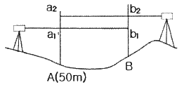 그림과 같이 교호수준측량을 실시한 결과가 a1 = 0.63m, a2 = 1.25m, b1 = 1.15m, b2 = 1.73m 이었다면, B점의 표고는? (단, A의 표고 = 50.00m)