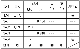 승강식 야장이 표와 같이 작성되었다고 가정할 때, 성과를 검산하는 방법으로 옳은 것은? (여기서, ⓐ-ⓑ는 두 값의 차를 의미한다.)