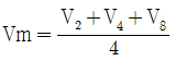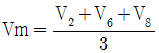 하천의 평균유속(Vm)을 구하는 방법 중 3점법으로 옳은 것은? (단, V2, V4, V6, V8 은 각각 수면으로부터 수심(h)의 0.2h, 0.4h, 0.6h, 0.8h인 곳의 유속이다.)