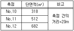 고속도로 공사에서 각 측점의 단면적이 표와 같을 때, 측점 10에서 측점 12개까지의 토량은? (단, 양단면평균법에 의해 계산한다.)