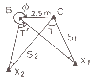 삼각점 C에 기계를 세울 수 없어서 2.5m를 편심하여 B에 기계를 설치하고 T′ = 31˚ 15′ 40″ 를 얻었다면 T는? (단, ø = 300° 20′, S1 = 2km, S2 = 3km)