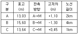 측점 M의 표고를 구하기 위하여 수준점 A, B, C로부터 수준측량을 실시하여 표와 같은 결과를 얻었다면 M의 표고는?