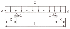 그림과 같이 단순지지된 보에 등분포하중 q가 작용하고 있다. 지점 C의 부모멘트와 보의 중앙에 발생하는 정모멘트의 크기를 같게하여 등분포하중 q의 크기를 제한하려고 한다. 지점 C와 D는 보의 대칭거동을 유지하기 위하여 각각 A와 B로부터 같은 거리에 배치하고자 한다. 이때 보의 A점으로부터 지점 C의 거리 X는?
