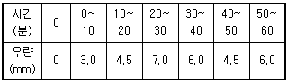 어느 유역에 1시간 동안 계속되는 강우기록이 아래 표와 같을 때 10분 지속 최대강우강도는?