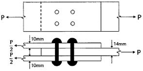 그림과 같은 강재의 이음에서 P=600kN이 작용할 때 필요한 리벳의 수는? (단, 리벳의 지름은 19mm, 허용전단응력은 110MPa, 허용지압응력은 240MPa이다.)