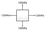 그림과 같이 이축응력(二軸應力)을 받는 정사각형 요소의 체적변형률은? (단, 이 요소의 탄성계수 E=2.0×105MPa, 푸아송 비 v=0.3이다.)