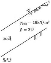 그림과 같이 c=0인 모래로 이루어진 무한사면이 안정을 유지(안전율≥1)하기 위한 경사각(β)의 크기로 옳은 것은? (단, 물의 단위중량은 9.81kN/m3이다.)