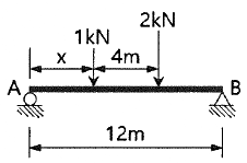 그림과 같은 보에서 두 지점의 반력이 같게 되는 하중의 위치(x)는 얼마인가?