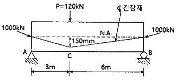 그림과 같은 단순지지 보에서 긴장재는 C점에 150mm의 편차에 직선으로 배치되고, 100 kN으로 긴장되었다. 보에는 120kN의 집중하중이 C점에 작용한다. 보의 고정하중은 무시할 때 C점에서의 휨모멘트는 얼마인가? (단, 긴장재의 경사가 수평압축력에 미치는 영향 및 자중은 무시한다.)