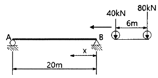 그림과 같이 2개의 집중하중이 단순보 위를 통과할 때 절대최대 휨모멘트의 크기(Mmax)와 발생위치(x)는?