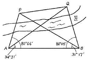 장애물로 인하여 접근하기 어려운 2점 P, Q를 간접거리 측량한 결과가 그림과 같다.