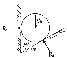 그림과 같이 밀도가 균일하고 무게가 W인 구(球)가 마찰이 없는 두 벽면 사이에 놓여 있을 때 반력 RA의 크기는?