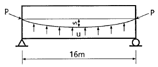 PS강재를 포물선으로 배치한 PSC보에서 상향의 등분포력(u)의 크기는 얼마인가? (단, P=2600kN, 단면의 폭(b)은 50cm, 높이()는 80cm, 지간 중앙에서 PS강재의 편심(s)은 20cm 이다.)